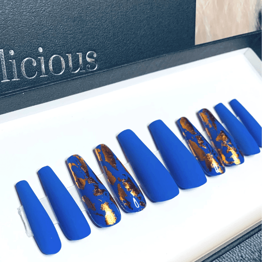 Blue Gold Foil Coffin Press On Nails