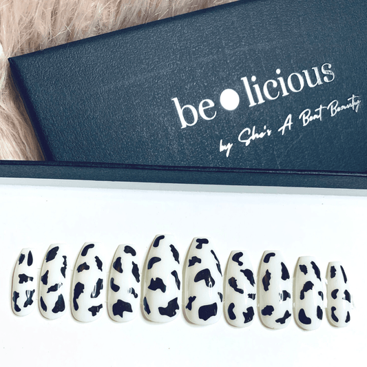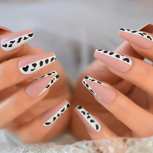 Beige White Cow Coffin Press On Nails